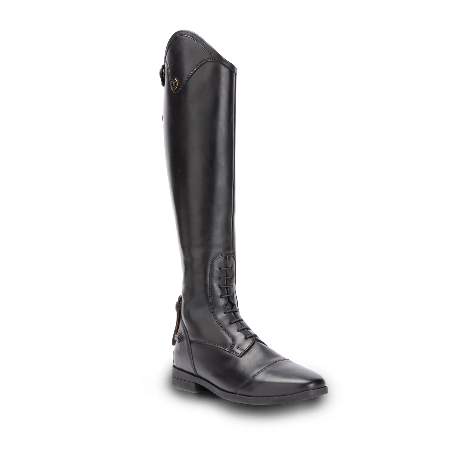 Lift your competition look with the sleek lines and elegant detail of Ortona long riding boots. The short height leg is specially shaped for a neat profile. Expertly constructed in smooth shape retaining leather, smartly polished to a high sheen finish making them ideal for the arena. The YKK® zip system offers a free running close fit with a contoured shape, zip guards give a tidy finish and protect against wear. A carefully engineered square toe and stretch mock laces offer classic style. Leather covered UltraFit panels sculpt the calf, dressage cut tops further enhance the shape for an elongated leg look. Key features: Milled cow leather. WickAway stay dry lining. Soft piqued leather inner trim. Stretch mock lace detail. Square toe. Dressage cut top. UltraFit leg panel. YKK® zip. Leather zip security tab. Leather zip guard. Leather covered spur rest. ActiveFlex insole. Moretta shock absorbing rubber outsole. Steel shanks.