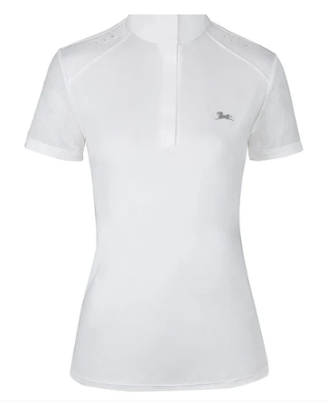 The Aerial short sleeve show shirt is the perfect medley of traditional show shirt elements and updated, modern style. The fabric features 37.5® patented thermoregulation technology which has proven to help your body manage its core temperature and increase stamina. It keeps you comfortable by helping your body to maintain an optimum relative humidity of 37.5° Celsius (99.5° Fahrenheit). The particles are naturally derived and work for the life of the product (it will never wash out!). This style also features a textured mesh for added breathability and style, as well as laser cut vent holes. The zipper placket with snap collar modernizes this traditional look.