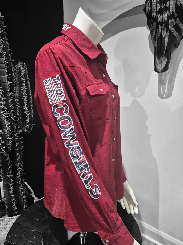 Here comes the burgundy shirt every cowgirl’s been dreaming of. 100% cotton, 100% style and 200% ready to turn heads – Whether you’re saddling up or steppig out. Comfy like your favorite hoodie, but with the attitude to match a rowdy country night. And he cherry on top? Snap buttons – so you can throw it on (or off) faster than a bull charges out of the chute. Classy, bold and made to ride!